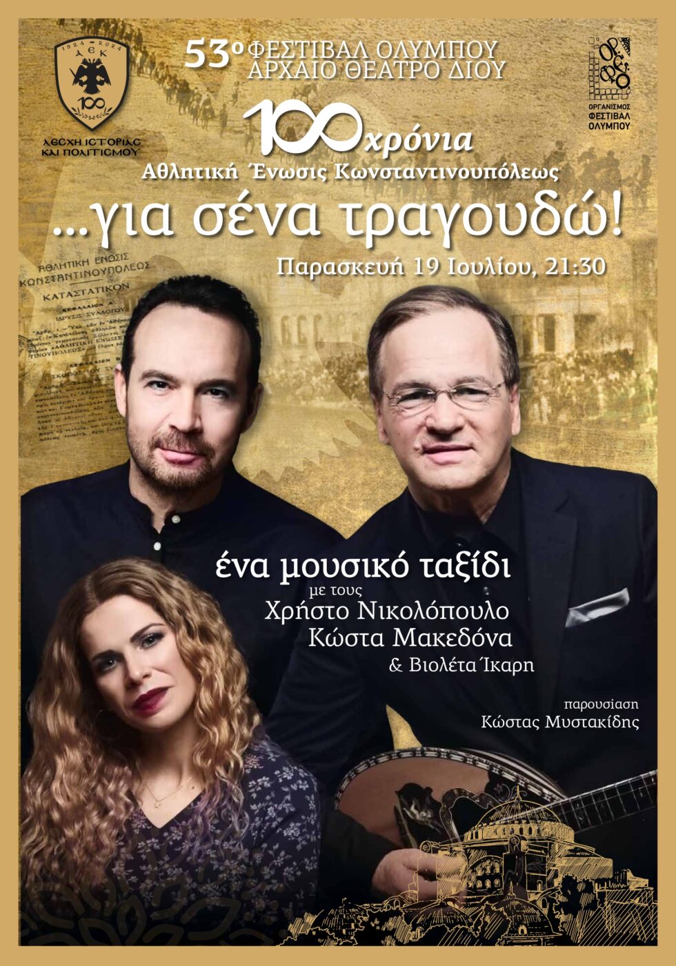 Το πρώτο μέρος της συναυλίας που φέρει τον τίτλο «100 Χρόνια Αθλητική Ένωσις Κωνσταντινουπόλεως … για σένα τραγουδώ» και θα φιλοξενηθεί την Παρασκευή 19 Ιουλίου 2024, ώρα 21:30, στο αρχαίο θέατρο Δίου, πάντα στο πλαίσιο του 53ου Φεστιβάλ Ολύμπου, περιλαμβάνει ως πρόλογο ένα πέρασμα ακουσμάτων με παραδοσιακά μουσικά όργανα και ήχους της καθ’ ημάς Ανατολής.