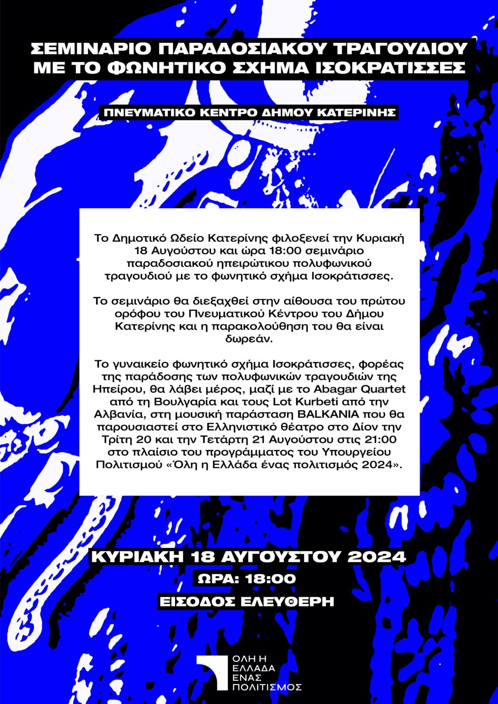 Το σεμινάριο διοργανώνεται σε συνάρτηση με τη μουσική παράσταση «Βαλκάνια» που φιλοξενεί τα τρία φωνητικά σύνολα Ισοκράτισσες από την Ελλάδα, Lot Kurbeti από την Αλβανία και Abagar Quartet από τη Βουλγαρία