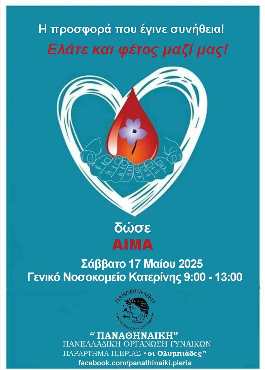 Δίνουμε το ετήσιο ραντεβού μας στο Γ.Ν Κατερίνης, το Σάββατο στις 17 Μαΐου και ώρα 9:00 με 13:00.