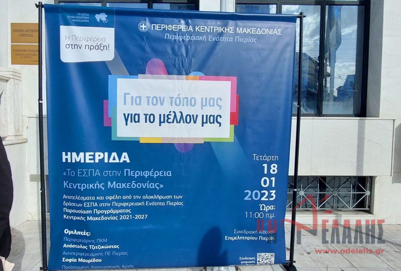 Παρουσία του Περιφερειάρχη Κεντρικής Μακεδονίας κ. Απόστολου Τζιτζικώστα πραγματοποιήθηκε ημερίδα με θέμα «Το ΕΣΠΑ στην Περιφέρεια Κεντρικής Μακεδονίας» και ειδικότερα στην Περιφερειακή Ενότητα Πιερίας, την Τετάρτη 18 Ιανουαρίου 2023, στη συνεδριακή αίθουσα του Επιμελητηρίου Πιερίας. Η εκδήλωση αφορούσε αφενός την ενημέρωση για το τρέχον ΕΣΠΑ και τα αποτελέσματα και τα οφέλη από τις δράσεις και τα έργα του και αφετέρου το περιεχόμενο του Προγράμματος της Περιφέρειας Κεντρικής Μακεδονίας της νέας προγραμματικής περιόδου 2021-2027.