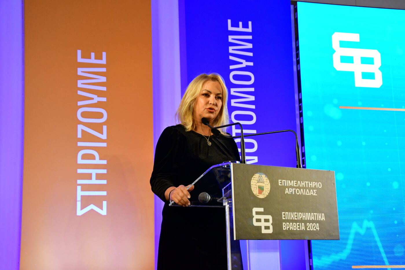 Στην Αργολίδα, σε ένα πολυπληθές κοινό, στη διοργάνωση των Επιχειρηματικών Βραβείων, ενός νέου θεσμού του Επιμελητηρίου Αργολίδος, η Υφυπουργός Ανάπτυξης, εκπροσωπώντας τον Πρωθυπουργό Κυριάκο Μητσοτάκη και την Κυβέρνηση, είχε την ευκαιρία να απονείμει βραβεία σε τοπικές επιχειρήσεις που ξεχώρισαν με τις επιδόσεις τους.