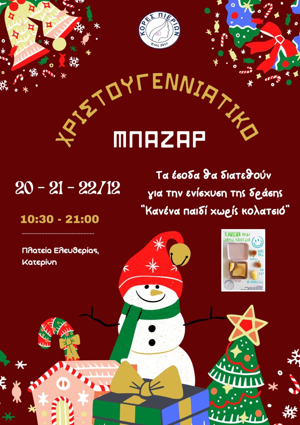 Ο σύλλογος Κόρες Πιερίων σας προσκαλεί στο χριστουγεννιάτικο μπαζάρ που διοργανώνει από την Παρασκευή 20 μέχρι και την Κυριακή 22 Δεκεμβρίου 2024, από τις 10:30 μέχρι τις 21:00, στην πλατεία Ελευθερίας.