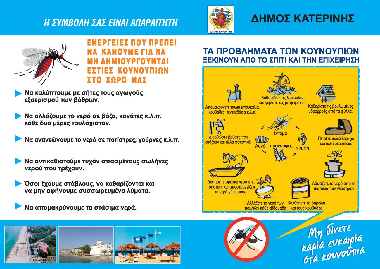 Το πρόγραμμα καταπολέμησης των κουνουπιών υλοποιείται κάθε χρόνο από την Περιφέρεια Κεντρικής Μακεδονίας, σε κάθε περιφερειακή ενότητα. Προκειμένου να υπάρξει ακόμη μεγαλύτερη αποτελεσματικότητα και να μειωθεί στο ελάχιστο η όχληση τους θερινούς μήνες ο Δήμος Κατερίνης, προχώρησε σε συμπληρωματικό πρόγραμμα, παράλληλα με τους ψεκασμούς από εδάφους & αεροψεκασμούς για την καταπολέμηση των κουνουπιών που διενεργεί η Περιφέρεια Κεντρικής Μακεδονίας.