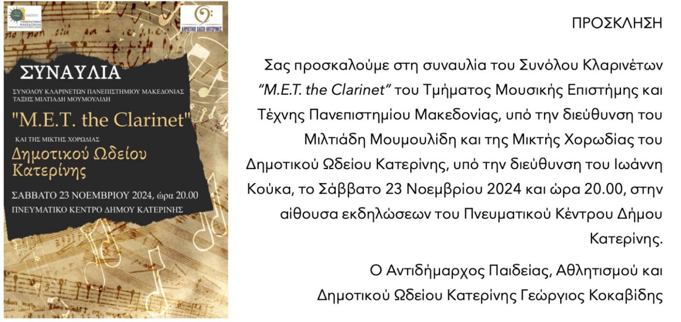 Δημοτικό Ωδείο Κατερίνης – Συναυλία: “Μ.Ε.Τ. THE CLARINET”