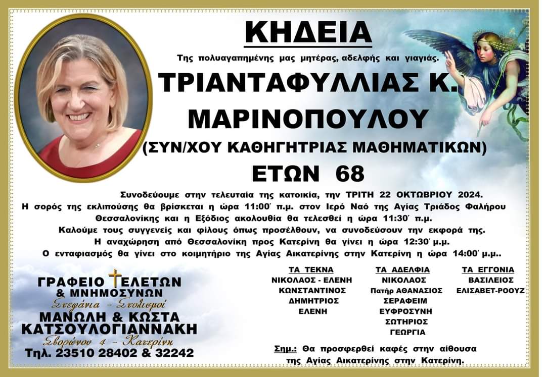 «Έφυγε» από τη ζωή, η Τριανταφυλλιά Κ. Μαρινοπούλου (Συν/χος καθηγήτρια μαθηματικών) σε ηλικία 68 ετών και σκόρπισε τη θλίψη σε συγγενείς και φίλους.