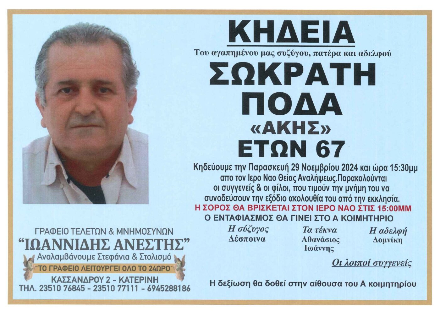 «Έφυγε» από τη ζωή, ο Σωκράτης Πόδας ηλικία 67 ετών και σκόρπισε τη θλίψη σε συγγενείς και φίλους.