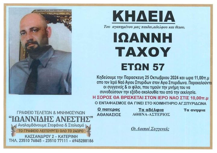 «Έφυγε» από τη ζωή, ο Ιωάννης Τάχος σε ηλικία 57 ετών και σκόρπισε τη θλίψη σε συγγενείς και φίλους.