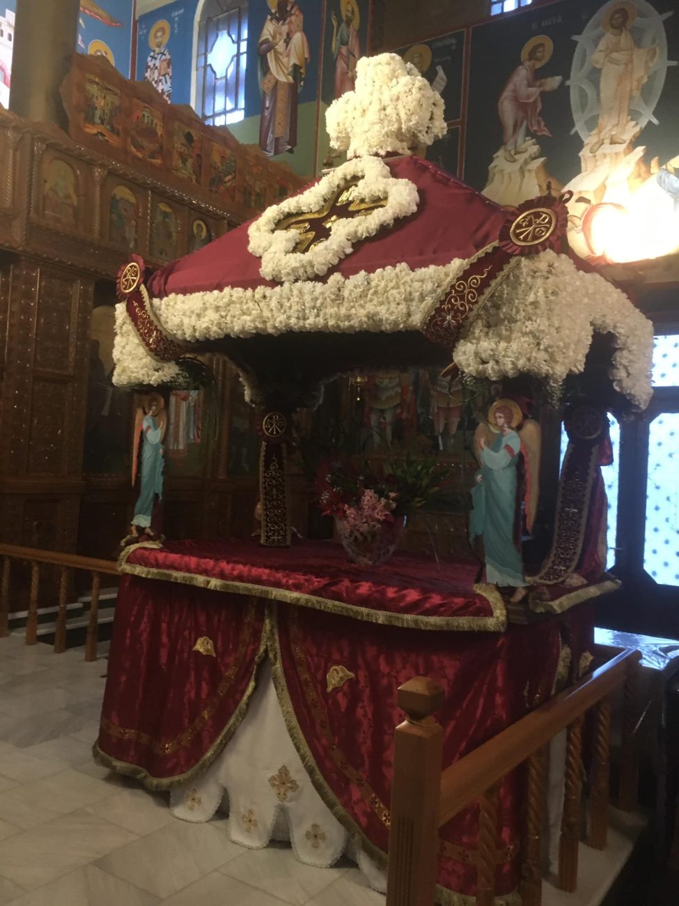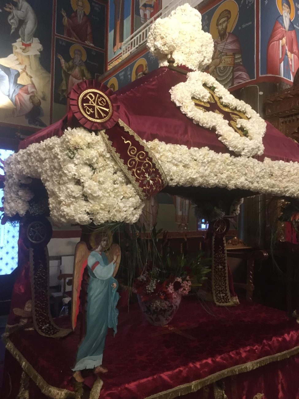 Με λευκά και κόκκινα γαρύφαλλά στολισμένος φέτος ο επιτάφιος του Ιερού Ναού Αιγών Κωνσταντίνου και Ελένης Ελατοχωρίου.