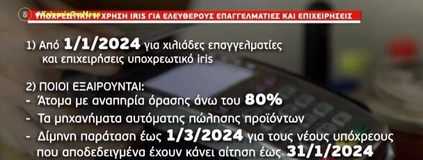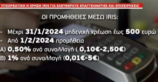 Από την Πρωτοχρονιά του 2024, ξεκίνησε η υποχρεωτική χρήση POS σε κλάδους όπως οι λαϊκές, τα πανηγύρια, τα περίπτερα και τα ταξί που μέχρι τώρα την είχαν γλιτώσει, ενώ και με την χρήση IRIS θα μπορούν να πραγματοποιούνται συναλλαγές.