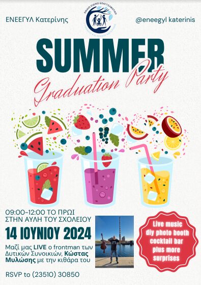 Το Ενιαίο Ειδικό Επαγγελματικό Γυμνάσιο & Λύκειο Κατερίνης σας προσκαλεί στην καλοκαιρινή γιορτή – Graduation Summer Party.