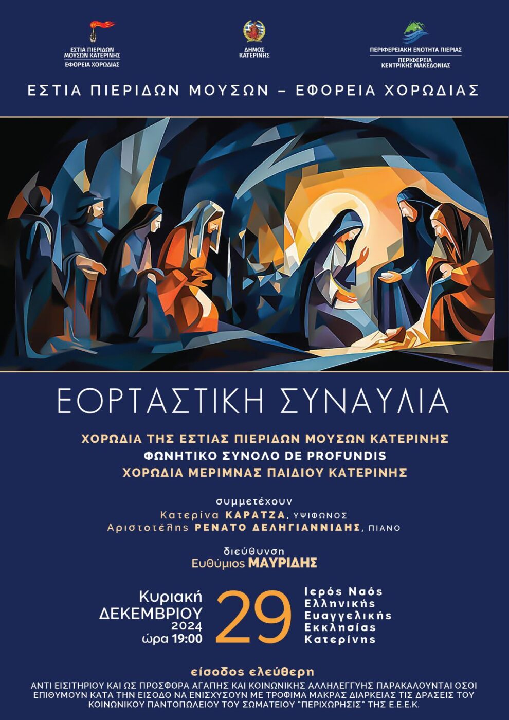 Έχουμε την τιμή και τη χαρά να σας προσκαλέσουμε στην ΕΟΡΤΑΣΤΙΚΗ ΣΥΝΑΥΛΙΑ της χορωδίας μας και του φωνητικού συνόλου ” de profundis”, την Κυριακή 29 Δεκεμβρίου και ώρα 19:00 ,στον Ιερό Ναό της Ελληνικής Ευαγγελικής Εκκλησίας Κατερίνης. Αντί εισιτηρίου και ως προσφορά αγάπης και κοινωνικής αλληλεγγύης,παρακαλούνται όσοι επιθυμούν, κατά την είσοδο,να ενισχύσουν με τρόφιμα μακράς διάρκειας,τις δράσεις του κοινωνικού παντοπωλείου του σωματείου “ΠΕΡΙΧΩΡΗΣΙΣ” της Ε.Ε.Ε.Κ.