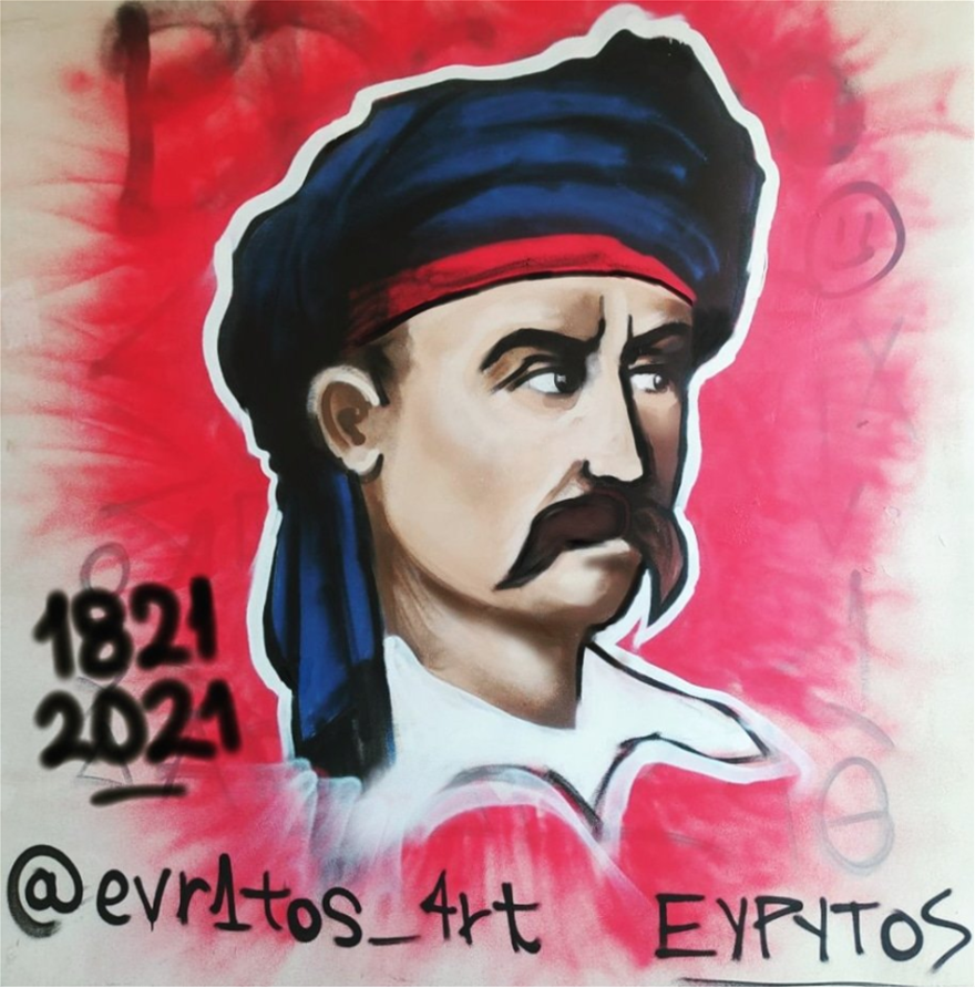 Πρόκειται για δημιουργίες του 18χρονου καλλιτέχνη γκράφιτι, με το ψευδώνυμο Εύρυτος, που μέσα από τα έργα του τιμάει την επέτειο των 200 χρόνων από την Εθνεγερσία, απαντώντας -όπως λέει με νόημα- σ’ όσους επιδιώκουν να γκριζάρουν το μήνυμα των Αγωνιστών του 1821.