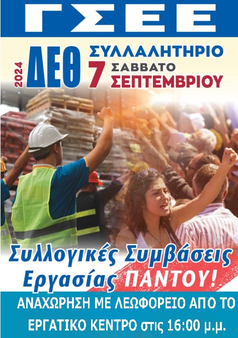 Το Εργατικό Κέντρο Κατερίνης καλεί όλους τους εργαζόμενους, τους συνταξιούχους, τους ανέργους της Πιερίας να πάρουν μέρος στο Συλλαλητήριο διαμαρτυρίας, το ΣΑΒΒΑΤΟ 7 Σεπτέμβρη 2024 στις 18.00 στο Άγαλμα του Βενιζέλου στη ΘΕΣΣΑΛΟΝΙΚΗ και στην πορεία διαμαρτυρίας που θα ακολουθήσει.