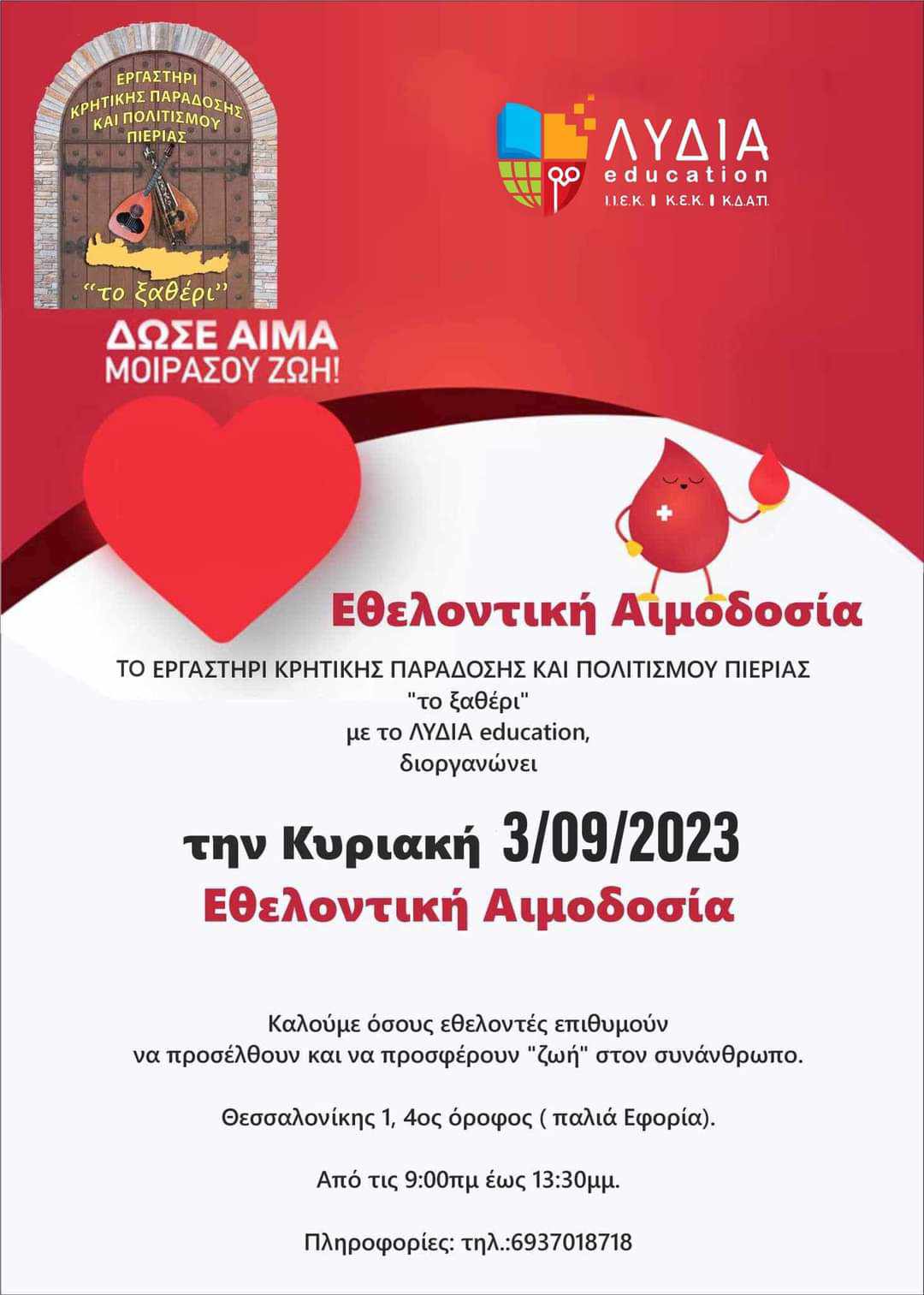 Το Εργαστήρι Κρητικής Παράδοσης και Πολιτισμού Πιερίας “Το ξαθέρι”, προέβη προχθες, στις 3/9/2023, σε εθελοντική αιμοδοσία, στα γραφεία του συλλόγου μας.