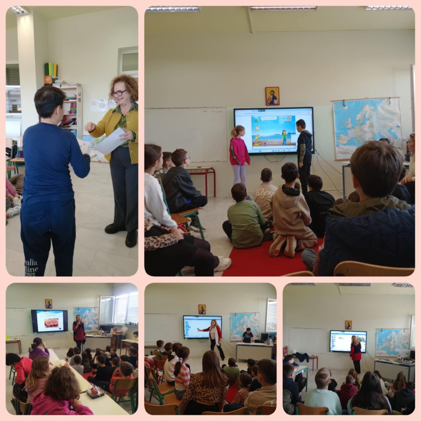 Το διάστημα 14-27 Οκτωβρίου είχε οριστεί για φέτος ως Ευρωπαϊκή εβδομάδα προγραμματισμού με στόχο την Προώθηση δραστηριοτήτων που σχετίζονται με την υπολογιστική σκέψη, τον προγραμματισμό και την τεχνολογία καθώς και την υλοποίηση ιδεών με τη συγγραφή κώδικα και τη μεγαλύτερη προβολή του. Το σχολείο μας συμμετείχε και φέτος στην εβδομάδα κώδικα code week 2024 με την εκπαιδευτικό κ. Θώμη Μαργαρίτη και το τμήμα ΣΤ2. Οι μαθητές αφού εκπαιδεύτηκαν στην εφαρμογή οπτικού προγραμματισμού Scratch, δημιούργησαν: α) ένα παιχνίδι γνώσεων γεωγραφίας με τις πρωτεύουσες των νομών της Ελλάδας και β) μια αριθμομηχανή που εκτελεί τις τέσσερις πράξεις. Στη συνέχεια σε ειδική εκδήλωση του σχολείου έγινε η παρουσίαση της εφαρμογής από τους ίδιους τους μαθητές. Τέλος, ενθάρρυναν όλους τους μαθητές του σχολείου να «χρησιμοποιήσουν» τα έργα τους. Οι μικρές τάξεις ασχολήθηκαν με την αριθμομηχανή και οι μεγάλες και με τα δύο παιχνίδια. Ο ενθουσιασμός των παρευρισκόμενων ήταν μεγάλος και αποτυπώθηκε στην ενεργό συμμετοχή τους και στην άρνηση τους να αποχωρήσουν μετά το τέλος της εκδήλωσης! Η εκδήλωση τελείωσε με την απονομή των βεβαιώσεων συμμετοχής στους μαθητές του ΣΤ2, που υλοποίησαν τη δράση, από την Διευθύντρια του σχολείου κ. Ζωή Κουτσουρά.