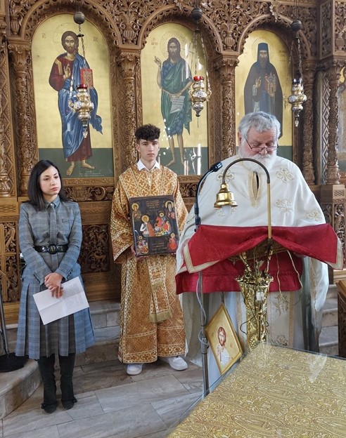 Κυρία Γεωργία Γραίκου, η Ενορία μας ως δείγμα τιμής και αναγνώρισης της αξιέπαινης επιστημονικής σας προσπάθειας, σας επιδίδει ως ευλογία και αναμνηστικό από το φετινό 28ο ΑΝΤΑΜΩΜΑ, μια εικόνα η οποία έχει στο κέντρο της τον Άγιο Δημήτριο για τον Ιερό Ναό του οποίου, κοπιάσετε τόσο πολύ κατά τη διάρκεια της έρευνας και συγγραφής της μεταπτυχιακής σας εργασίας. Επίσης, στις 4 γωνίες της ιερής εικόνας απεικονίζονται: η Αγία Παρασκευή Προστάτις και Πολιούχος της Ενορίας μας, ο Άγιος Γέωργιος ο Χιοπολίτης, ο οποίος αποτελεί τον προσωπικό σας Άγιο και στην μνήμη του οποίου γιορτάζετε την ονομαστική σας εορτή, ο Άγιος Διονύσιος εν Ολύμπω, Προστάτης και Έφορος της Πιερίας μας και η Αγία Αικατερίνη, Προστάτις και Πολιούχος της πρωτεύουσας του Νομού μας.
