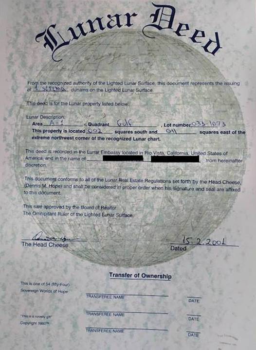 Ωστόσο, οι πράξεις του Hope είναι αντίθετες με το Δίκαιο του Διαστήματος, όπως αυτό έχει καθορισθεί από τη διεθνή κοινότητα. Αυτό, όμως, δεν τον εμπόδισε από το να διευρύνει την επιχείρησή του και να παρέχει στους πελάτες του τη δυνατότητα να αγοράσουν διαδικτυακές διευθύνσεις της Σελήνης, καθώς και φεγγάρια που ανήκουν σε άλλους πλανήτες.