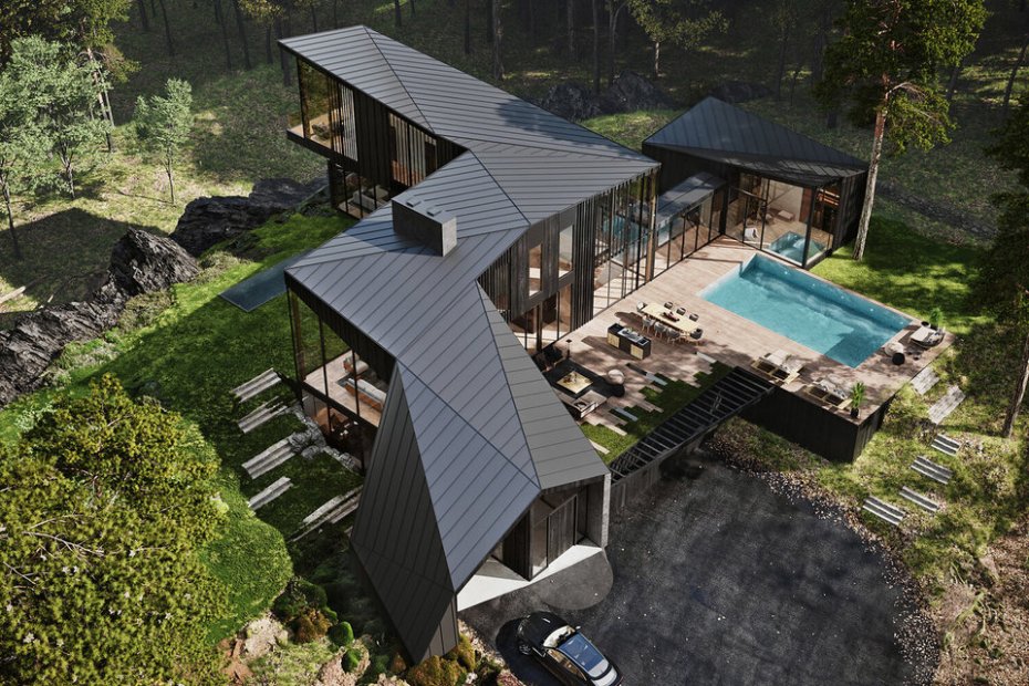 Η εντυπωσιακή κατοικία μοιάζει σαν να αναδύεται από το καταπράσινο έδαφος και έχει μια ακανόνιστη μορφή με σκοπό να μιμείται τους φυσικούς σχηματισμούς των βράχων που την περιβάλλουν. Το εξωτερικό της είναι κατασκευασμένο από σκούρο κέδρο, ένα υλικό που την βοηθά να αναμειγνύεται όμορφα με το φυσικό περιβάλλον.