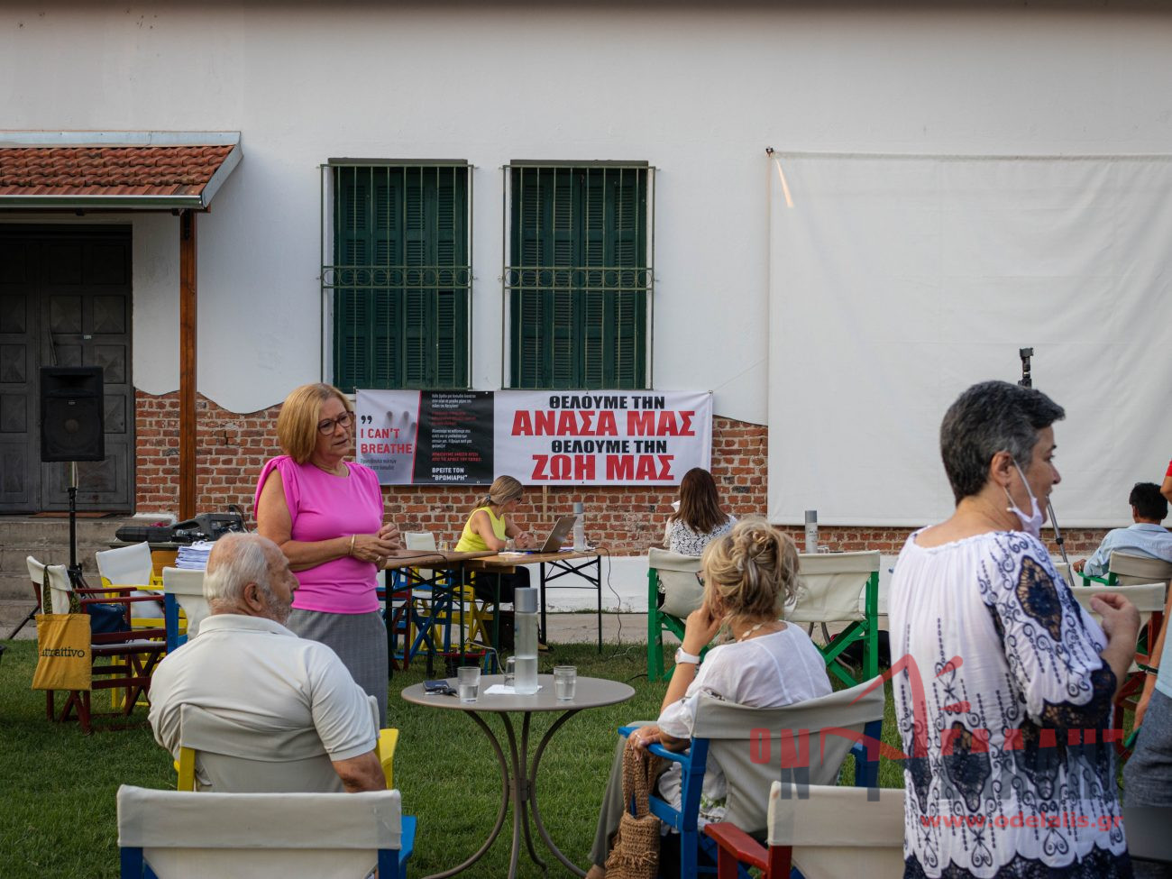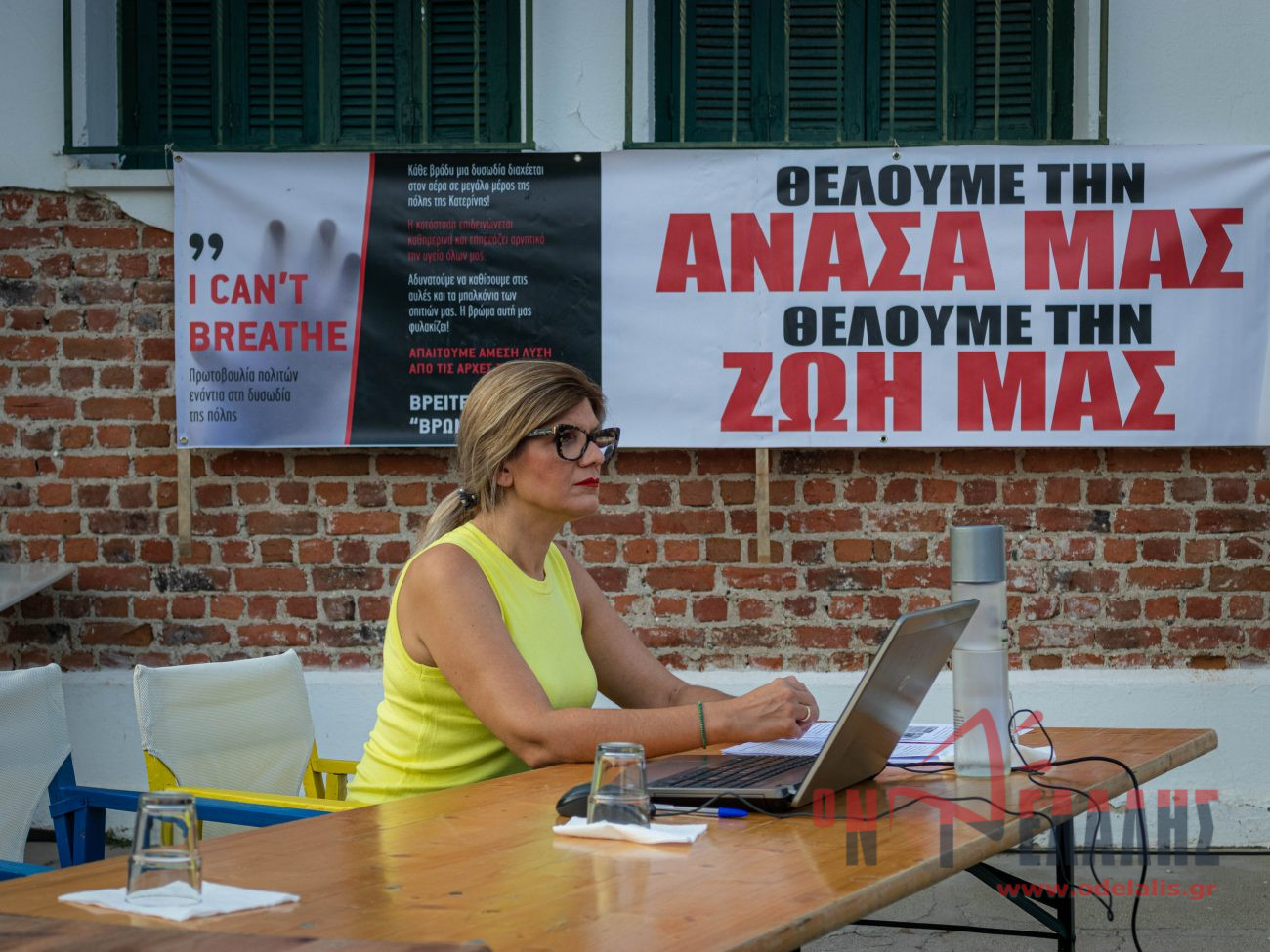 Την εκδήλωση άνοιξε με καλωσόρισμα και χαιρετισμό ο Γιώργος Κωτίδης ως εκπρόσωπος της Εθελοντικής Ομάδας Δράσης Ν. Πιερίας, η οποία παραχώρησε και τον χώρο του Καπνικού Σταθμού ώστε να πραγματοποιηθεί η συνέντευξη τύπου, και ακολούθησε σύντομος χαιρετισμός από τον Κώστα Χατζηιωαννίδη, μέλος της ομάδας «I can’t breathe».
