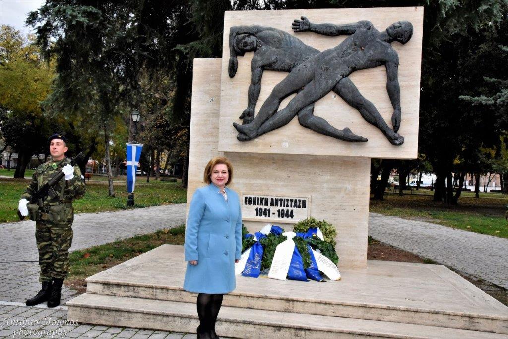 Σε δήλωσή της επισήμανε: «Αποδίδουμε τον οφειλόμενο φόρο τιμής στη γενιά που αγωνίστηκε, βασανίστηκε και έπεσε ηρωικά την περίοδο 1941-1944, συμβάλλοντας στην αποτίναξη των φασιστικών και ναζιστικών δυνάμεων κατοχής. Η αντιστασιακή δράση, μια από τις λαμπρότερες σελίδες στην σύγχρονη Ελληνική διαδρομή, σηματοδότησε τον ενωτικό χαρακτήρα που απαιτεί η Ελληνική κοινωνία. Ας μην λησμονούμε ότι το 1982 ο αείμνηστος πρωθυπουργός Ανδρέας Παπανδρέου με την καθιέρωση του εορτασμού αποκατέστησε την ιστορία και απεμπόλησε τις μέχρι τότε μισαλλοδοξίες.»
