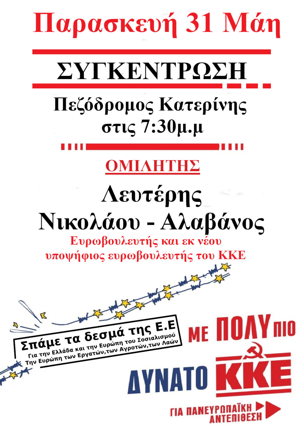 Όλοι στη συγκέντρωση του ΚΚΕ, την Παρασκευή 31 Μάη, στις 7:30μ.μ στον Πεζόδρομο Κατερίνης.