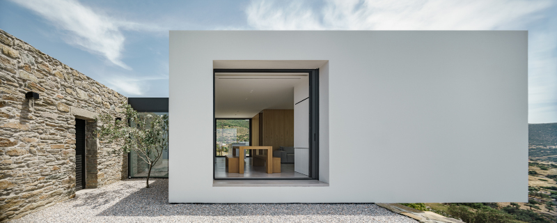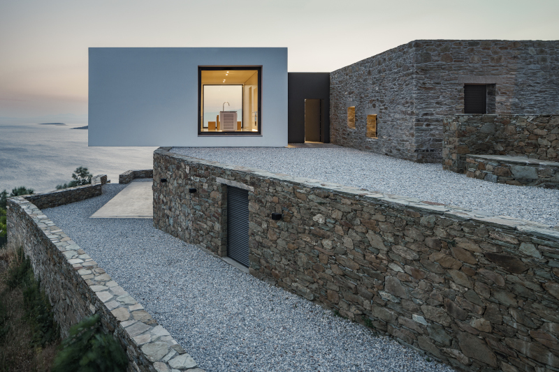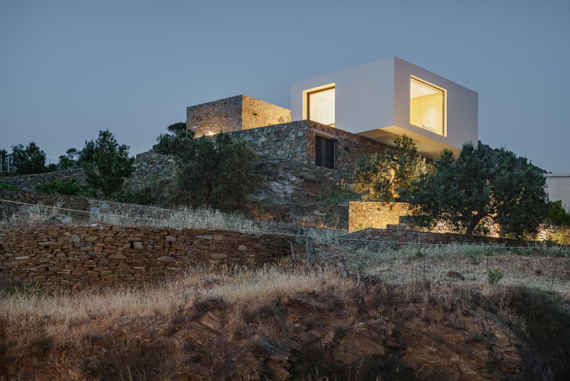 Εντύπωση όμως προκαλεί το λευκό κουτί στο βραχώδες τοπίο. Όπως σημειώνουν οι αρχιτέκτονες Χρήστος Γκότσης και Έλενα Σεραφειμίδου: «Το νέο κτίριο έρχεται στο οικόπεδο εισάγοντας νέο λεξιλόγιο στο τοπίο με έναν αυστηρό λευκό ορθογωνικό όγκο με μεγάλα ανοίγματα, που δεν αφήνει αμφιβολία για το αρχιτεκτονικό ύφος και την εποχή κατασκευής του.