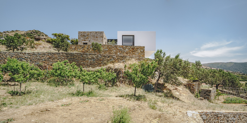 Επιλέγεται συνειδητά η διάκριση του παλαιού και νέου, απέχοντας από κάθε στοιχείο μίμησης του παρελθόντος. Σχεδιάζεται εκ νέου ένα λευκό κουτί, που σχεδόν σαν ξένο αντικείμενο “προσγειώνεται” στο τοπίο και ισορροπεί στη μία άκρη, στο πιο απότομο σημείο του οικοπέδου, δημιουργώντας μία χαρακτηριστική αιώρηση»