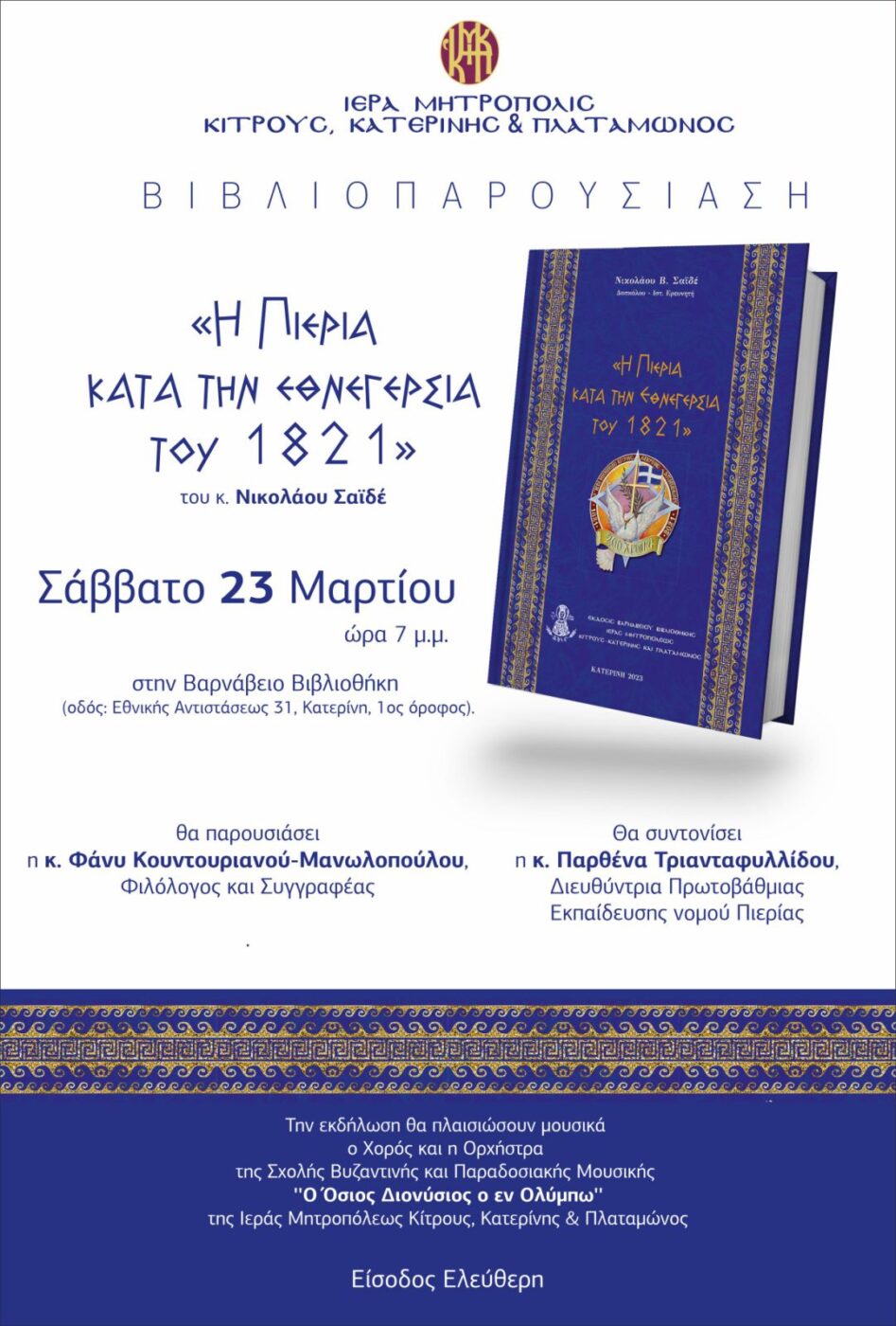 Μπροστά σε ένα πολυπληθές ακροατήριο, το Σάββατο 23 Μαρτίου, στην Βαρνάβειο Βιβλιοθήκη της Ιεράς Μητροπόλεως Κίτρους, Κατερίνης και Πλαταμώνος, πραγματοποιήθηκε η παρουσίαση του βιβλίου του συνταξιούχου Δασκάλου και Ιστορικού Ερευνητή κ. Νικολάου Σαϊδέ με τίτλο «Η Πιερία κατά την Εθνεγερσία του 1821».
