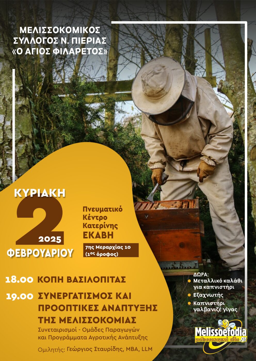 Ο Μελισσοκομικός Σύλλογος Πιερίας διοργανώνει την Κυριακή 2 Φεβρουαρίου 2025 και ώρα 18:00 στο Πνευματικό Κέντρο Κατερίνης ΕΚΑΒΗ την ετήσια κοπή Βασιλόπιτας και ομιλία με θέμα “Συνεργατισμός και προοπτικές ανάπτυξης της μελισσοκομίας” και καλεί τα μέλη και τους φίλους του να τον τιμήσουν με την παρουσία τους.