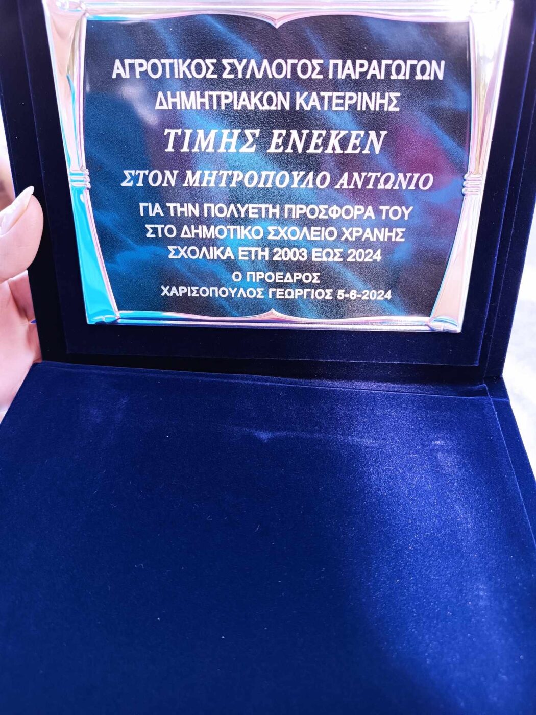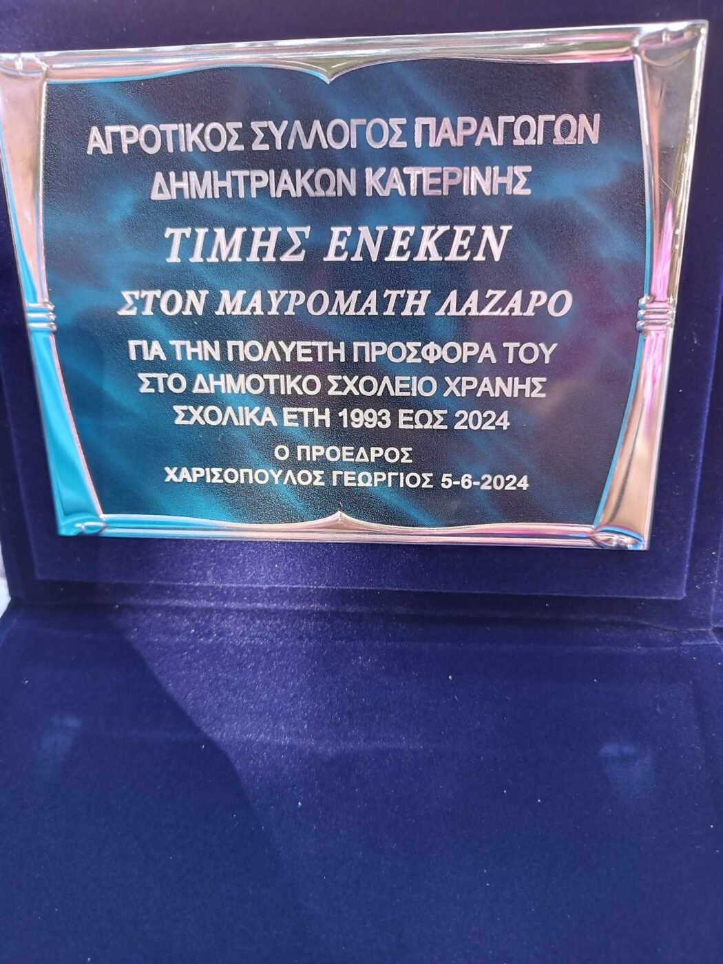 Στη σημερινή αποχαιρετιστήρια γιορτή του Δημοτικού Σχολείου στη Νέα Χράνη, ο Πρόεδρος του Αγροτικού Συλλόγου Κατερίνης Γιώργος Χαρισσόπουλος, τίμησε τους δασκάλους Λάζαρο Μαυρομάτη και Αντώνη Μητρόπουλο για την πολυετή προσφορά τους στο σχολείο απονέμοντας τους πλακέτες.