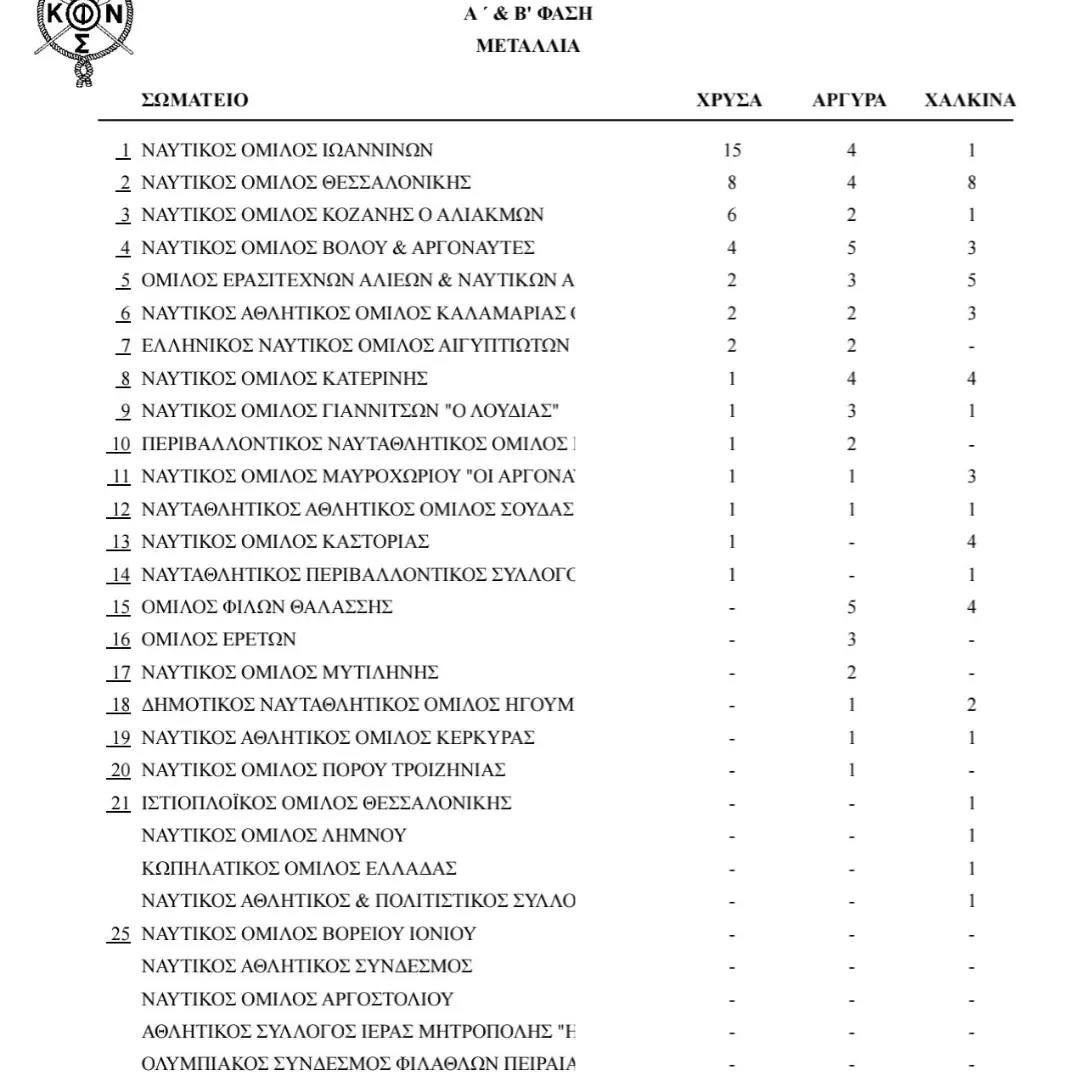 Μετά την ολοκλήρωση της Β’ φάσης, ο Ναυτικός Όμιλος Κατερίνης κατέκτησε την 8η θέση στην συνολική κατάταξη ανάμεσα σε 28 σωματεία.