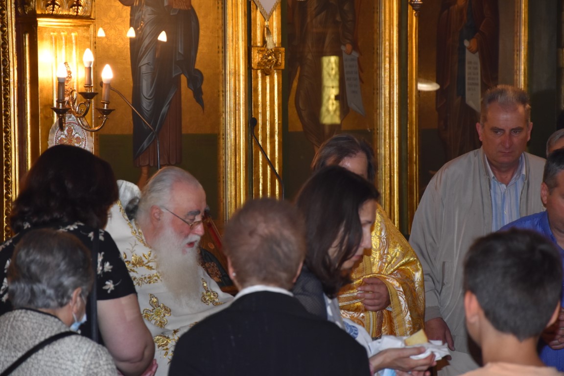 Κατά την έξοδό του από τον Ιερό Ναό, ο κ. Ντούμος αντάλλαξε ευχές για Χρόνια Πολλά και Καλή Φώτιση με γνωστούς και φίλους καθώς και με δεκάδες συμπολίτες του που έσπευσαν να τον χαιρετήσουν.