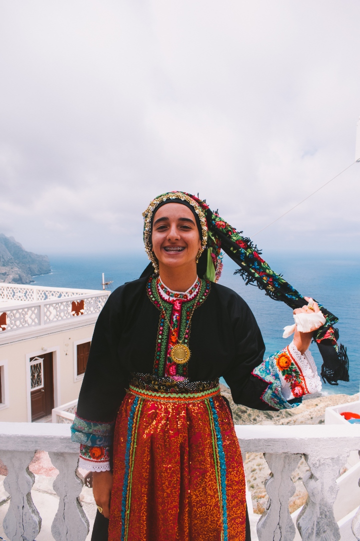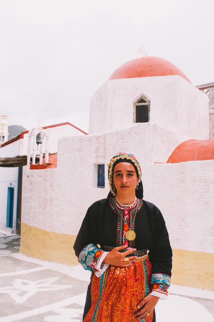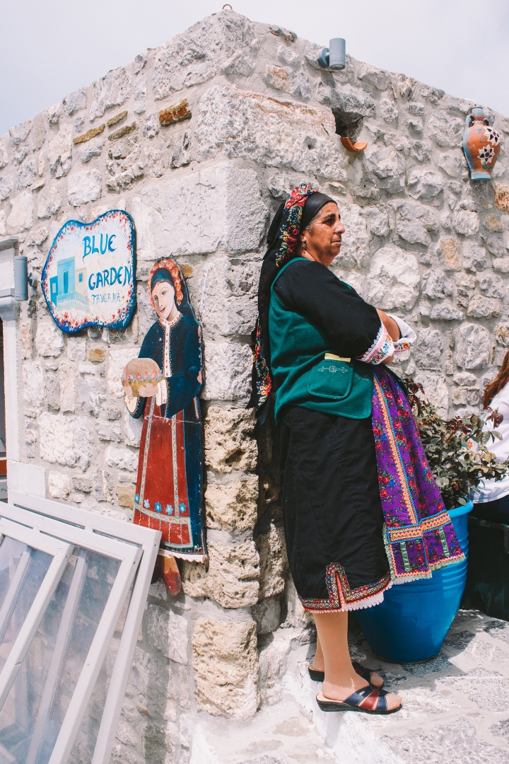 Το τοπίο κόβει την ανάσα. Γύρω μας υψώνονται απόκρημνα βουνά, χωρίς ίχνος βλάστησης, ενώ πάνω στις πλαγιές είναι χτισμένο ένα πανέμορφο χωριό με πολύχρωμα σπίτια και ανεμόμυλους σε κάθε του γωνιά. Ο άνεμος, σ’ αυτά τα ύψη, είναι δυνατός και κρύος παρόλο που βρισκόμαστε στην αρχή του καλοκαιριού. Με το που κάνουμε τα πρώτα βήματα πέφτουμε πάνω σε κάτι, για το οποίο μας είχαν μιλήσει όλοι όσοι είχαν την τύχη να επισκεφτούν το χωριό πριν από μας. Ο λόγος για τις γυναίκες της Ολύμπου που κρατούν την παράδοση ζωντανή και συνεχίζουν ως σήμερα να κυκλοφορούν στους δρόμους με τις παραδοσιακές στολές, έτσι όπως συνέβαινε κατά τους προηγούμενους αιώνες.