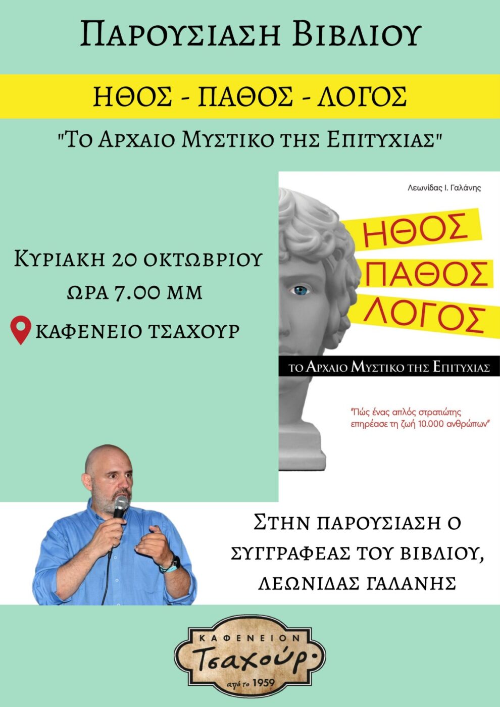 Την Κυριακή 20 Οκτωβρίου στις 19.00 θα πραγματοποιηθεί στο “Καφενείο Τσαχούρ” παρουσίαση του βιβλίου “Ήθος- Πάθος- Λόγος, το αρχαίο μυστικό της επιτυχίας”.