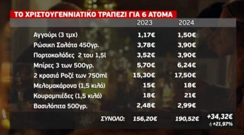 Σύμφωνα με τα παραπάνω στοιχεία, ένα τυπικό χριστουγεννιάτικο τραπέζι για έξι άτομα θα κοστίσει αρκετά παραπάνω φέτος.