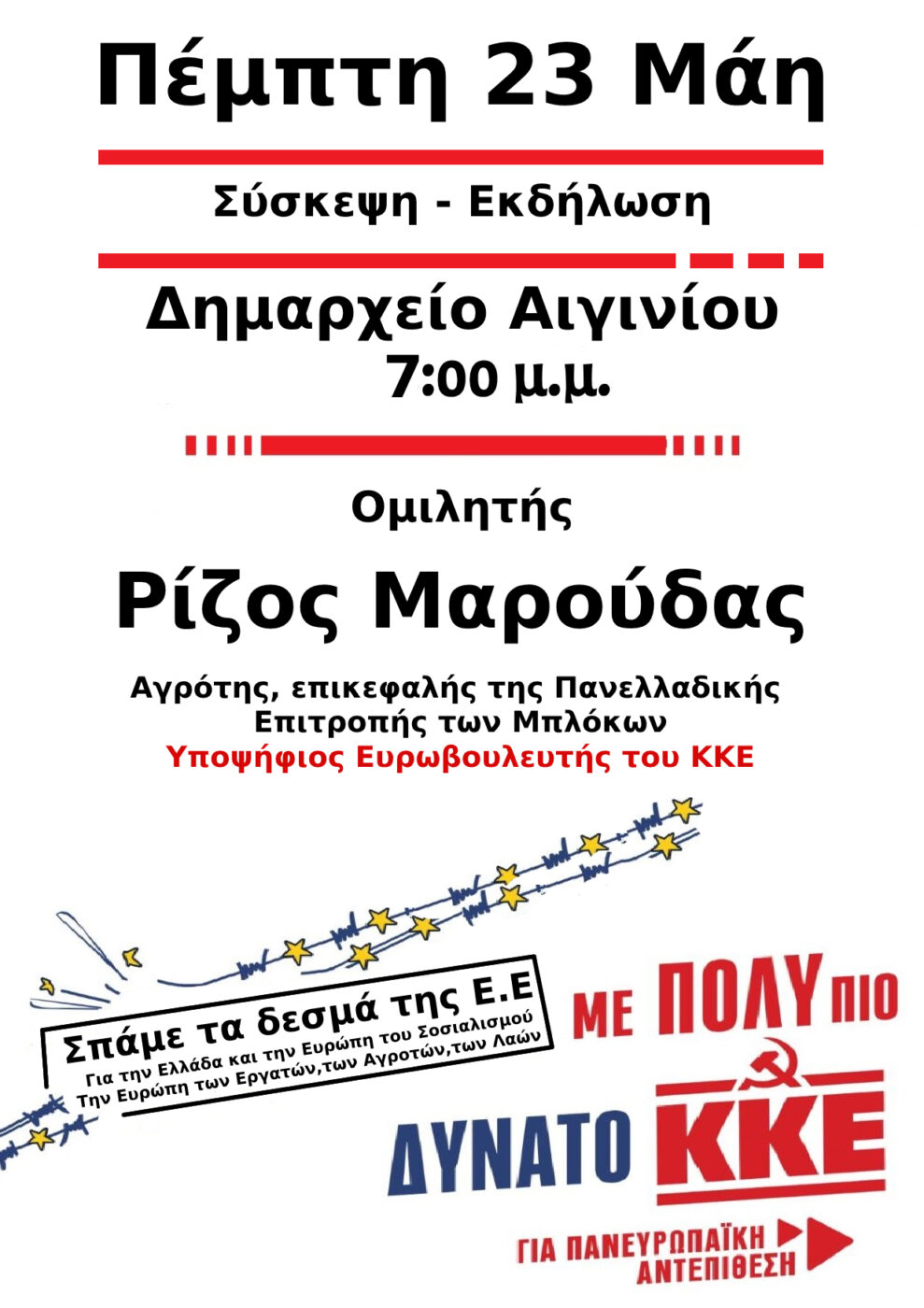 Την Πέμπτη 23 Μάη στις 7:00μμ θα πραγματοποιηθεί σύσκεψη – εκδήλωση της Τ.Ε. Πιερίας του ΚΚΕ στο Δημαρχείο Αιγινίου, με ομιλητή τον Ρίζο Μαρούδα, αγρότη, επικεφαλής της Πανελλαδικής Επιτροπής των Μπλόκων και