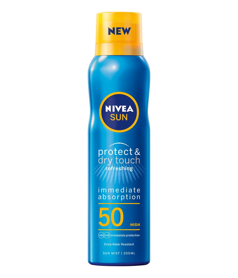 Nivea Sun Protect & Dry Touch Mist Spray SPF 50: Αδιάβροχο και αναζωογονητικό. Εκτός από υψηλή προστασία απορροφάται εύκολα χωρίς να δημιουργεί την ανεπιθύμητη λιπαρότητα.