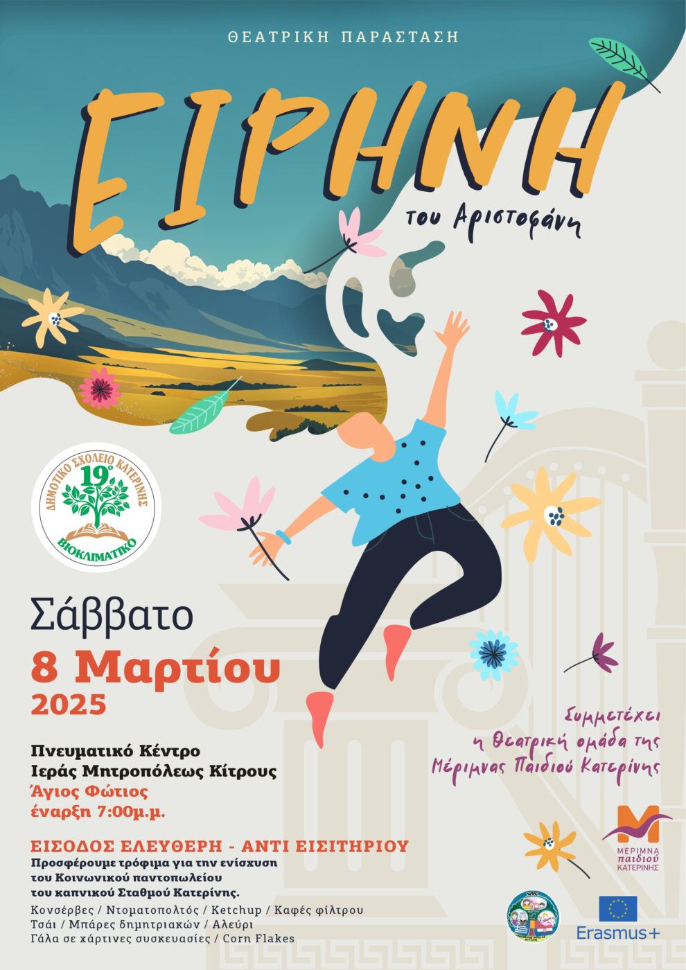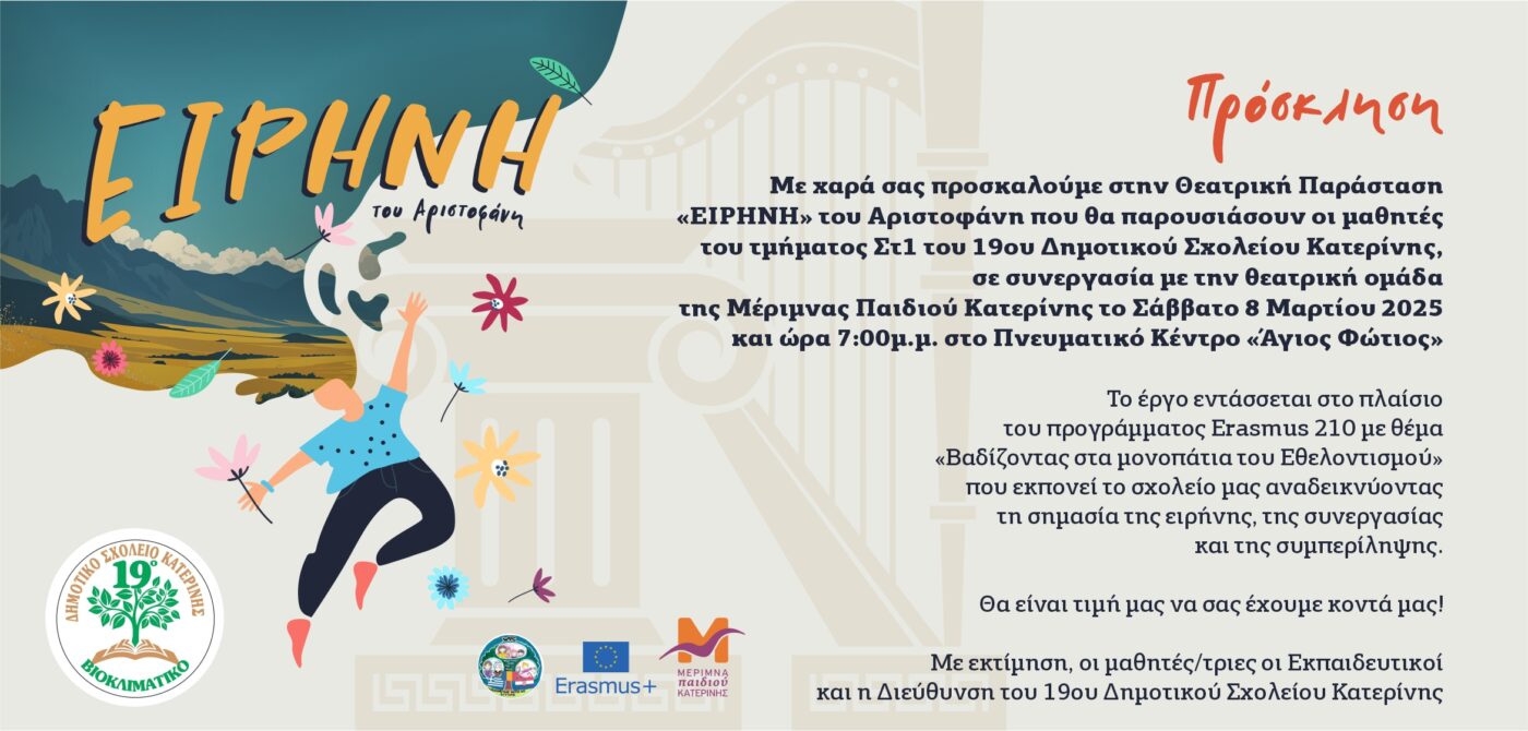 Το Σάββατο 8 Μαρτίου 2025 στις 19.00μμ στο Πνευματικό Κέντρο Άγιος Φώτιος της Ιεράς Μητρόπολης Κίτρους, Κατερίνης και Πλαταμώνα μια μικτή ομάδα, αποτελούμενη από μαθητές/τριες της Στ1 τάξης του 19ου Δημοτικού Σχολείου Κατερίνης και μαθητευόμενους της Μέριμνας Παιδιού Κατερίνης, θα παρουσιάσουν την «Ειρήνη» του Αριστοφάνη, κάνοντας πράξη την ιδέα της συμπερίληψης.