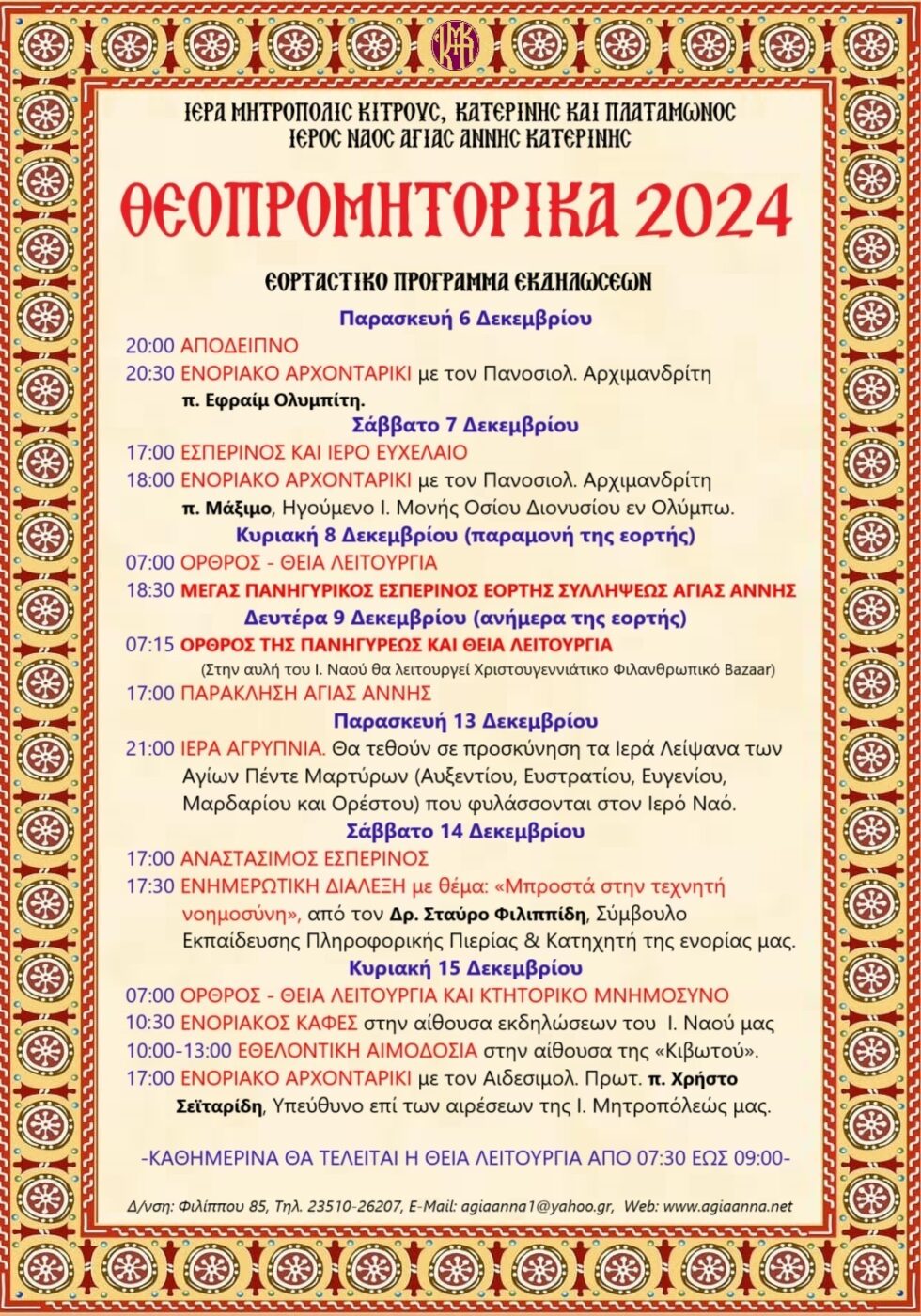 Για ακόμη μια χρονιά, ο Ιερός Ναός Αγίας Άννας Κατερίνης διοργανώνει τις καθιερωμένες λατρευτικές και πνευματικές εκδηλώσεις με την επωνυμία «ΘΕΟΠΡΟΜΗΤΟΡΙΚΑ».