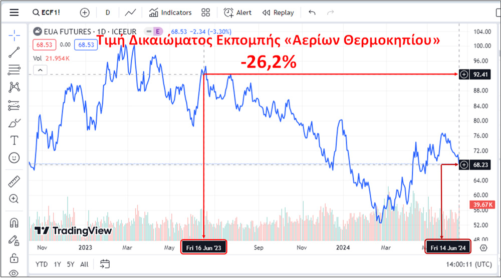Κι ακόμα πιο αδικαιολόγητη είναι η αύξηση με βάση αυτά που βλέπουμε στο 3ο διάγραμμα, που δείχνει τη μεταβολή της τιμής του “Δικαιώματος Εκπομπής Αερίων του Θερμοκηπίου”, (δηλαδή “αέρα κοπανιστού”): την Παρασκευή 16/6/2023 η τιμή ήταν €92,41, ενώ την Παρασκευή 14/6/2024 η τιμή έκλεισε στα €68,23, δηλαδή παρουσιάζει ΜΕΙΩΣΗ 26,2%!