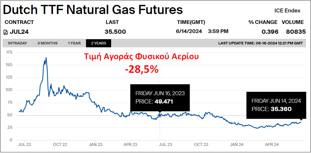 Η αύξηση αυτή ωστόσο είναι ΕΝΤΕΛΩΣ ΑΔΙΚΑΙΟΛΟΓΗΤΗ, όπως φαίνεται από το 2ο διάγραμμα, που δείχνει τη μεταβολή της τιμής του φυσικού αερίου (δείκτης Dutch TTF συμβόλαιο ενός μήνα) στο ίδιο διάστημα: την Παρασκευή 16/6/2023 η τιμή του φυσικού αερίου ήταν €49,471, ενώ την Παρασκευή 14/6/2024 η τιμή έκλεισε στα €35,36, δηλαδή παρουσιάζει ΜΕΙΩΣΗ 28,5%!