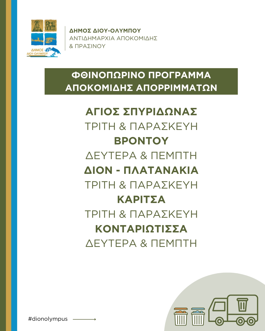 Το φθινοπωρινό πρόγραμμα αποκομιδής απορριμμάτων στις δώδεκα κοινότητες του Δήμου Δίου-Ολύμπου διαμορφώνεται ως εξής:
