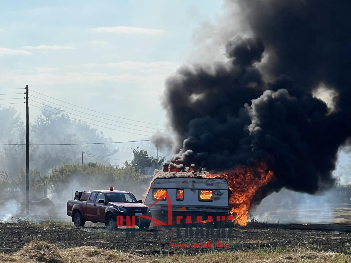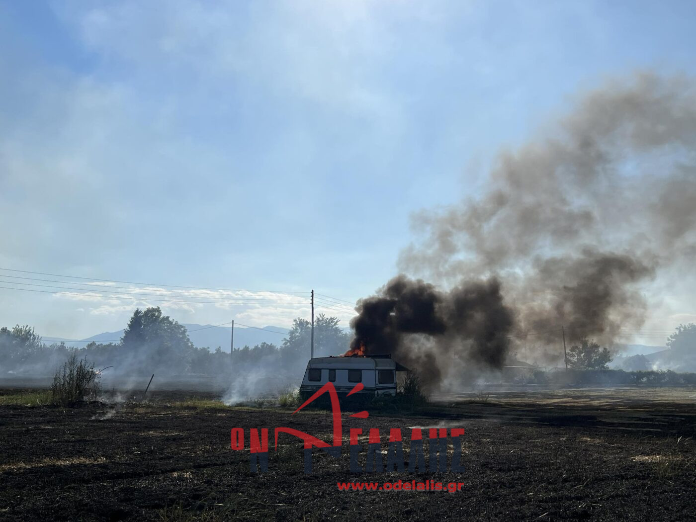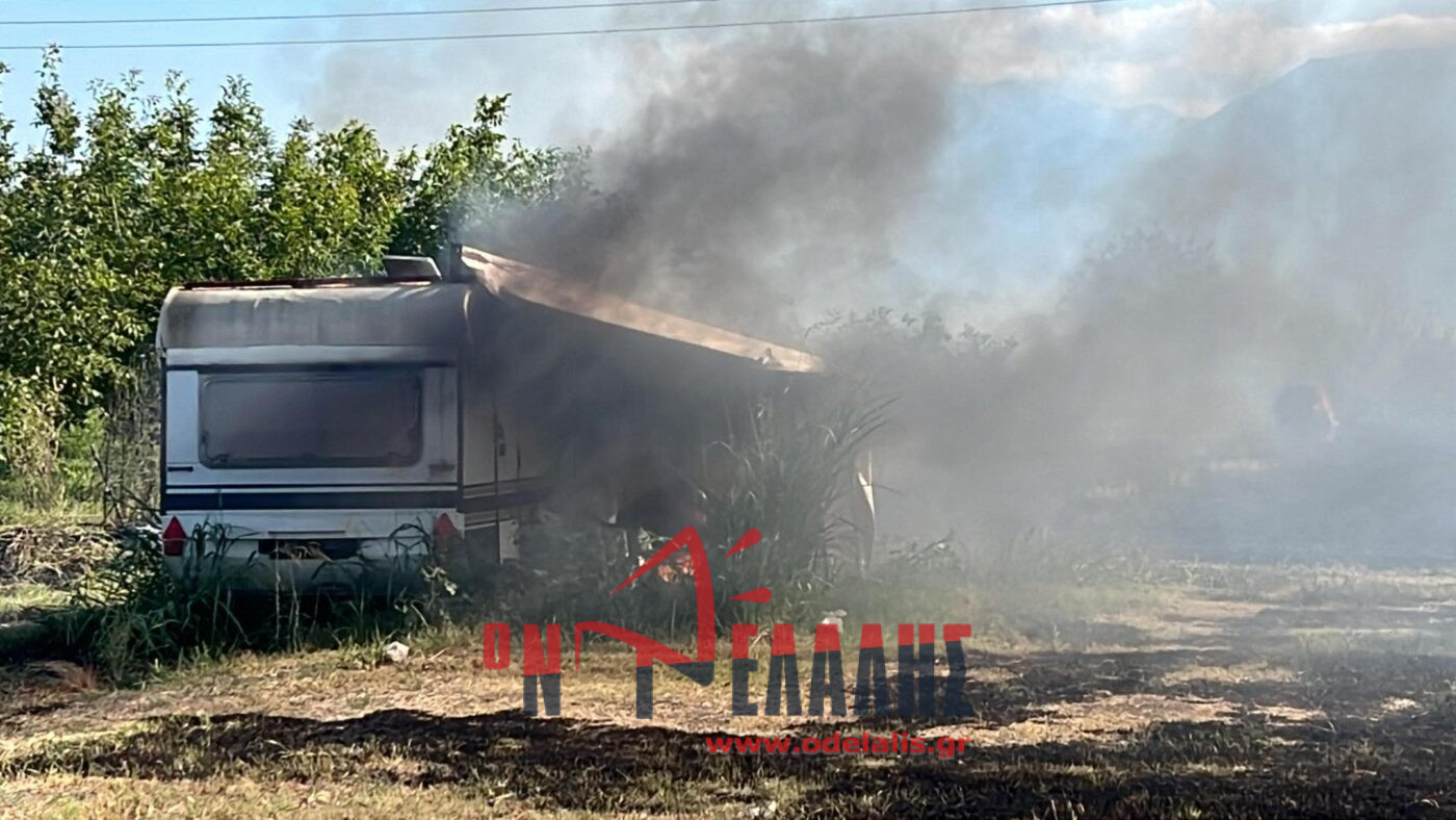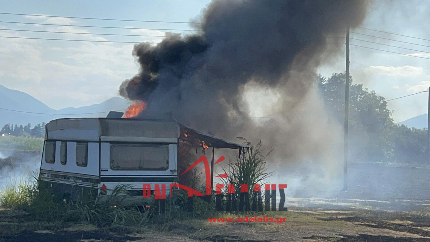 Στις φλόγες τυλίχθηκε ένα τροχόσπιτο που βρίσκεται μέσα σε χωράφι. Από τη φωτιά κινδυνεύει και σπίτι.