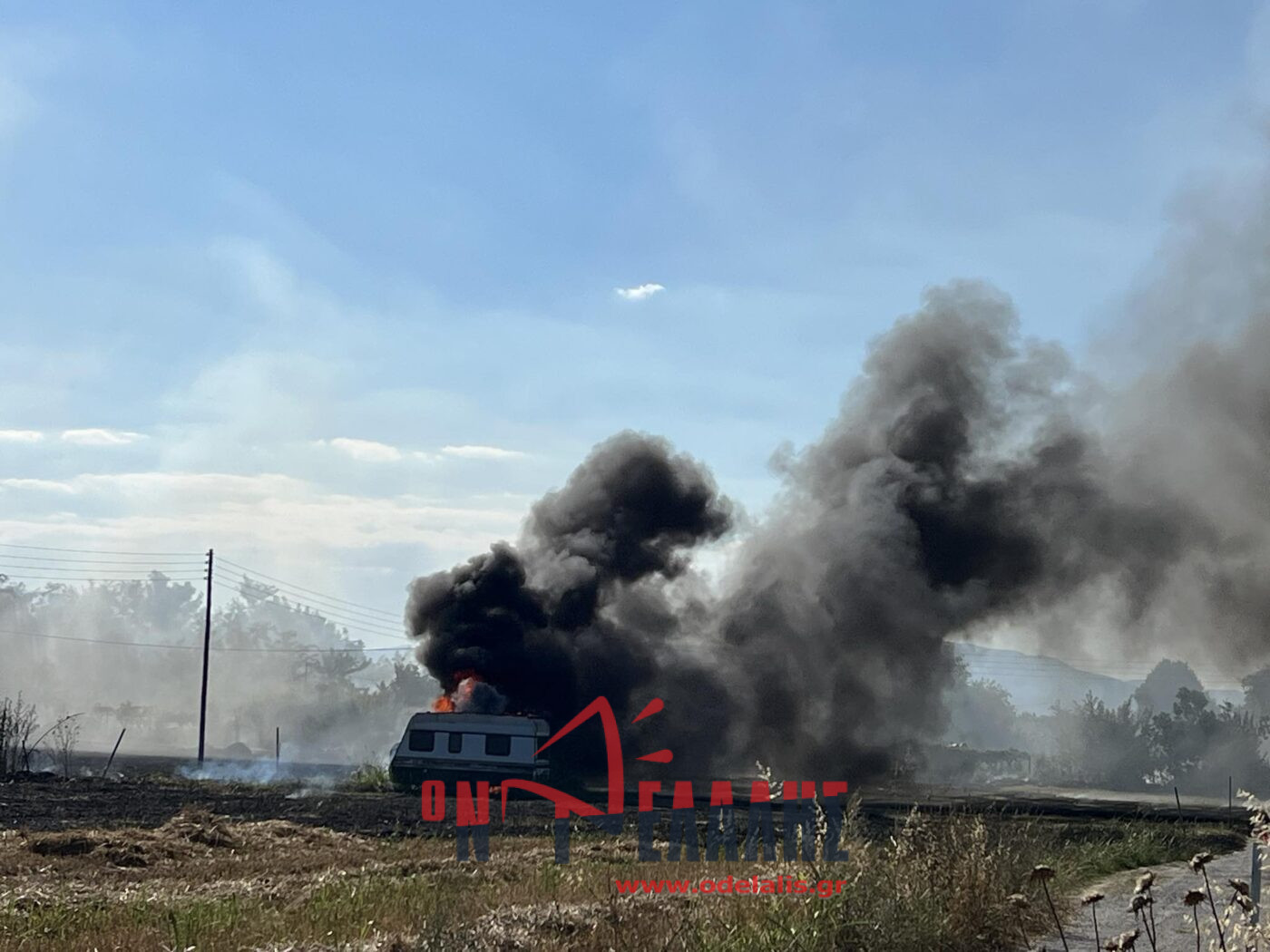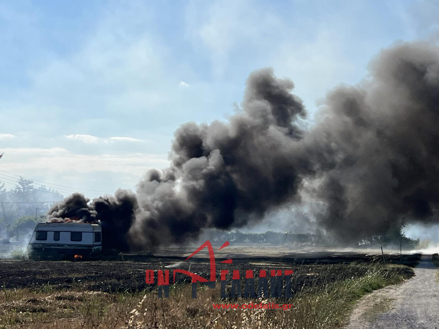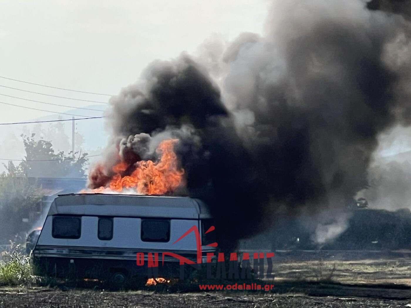 Στις φλόγες τυλίχθηκε ένα τροχόσπιτο που βρίσκεται μέσα σε χωράφι. Από τη φωτιά κινδυνεύει και σπίτι.