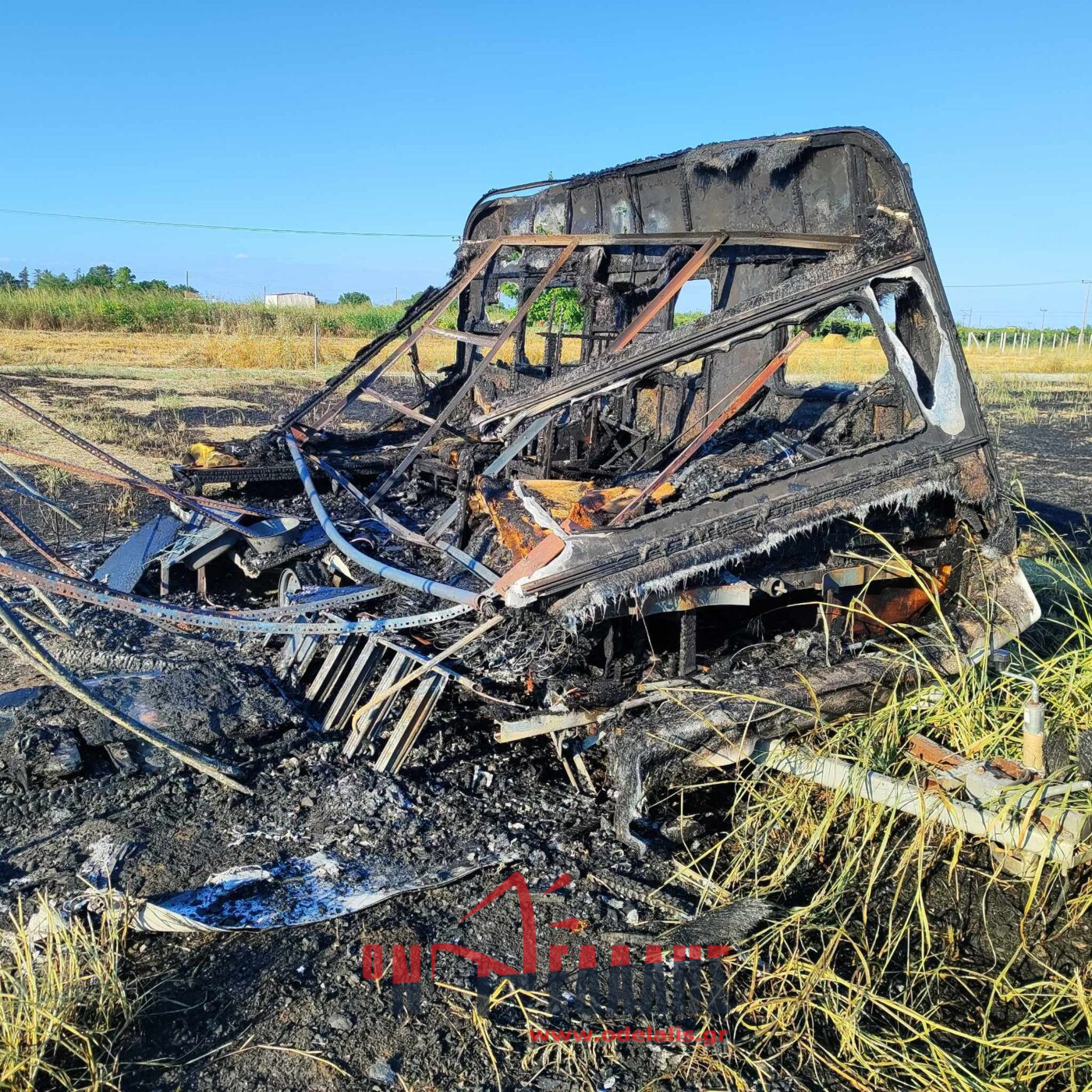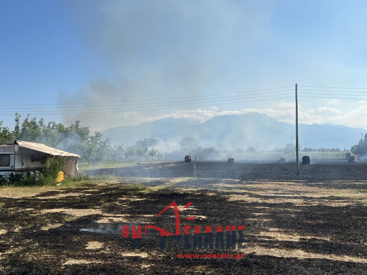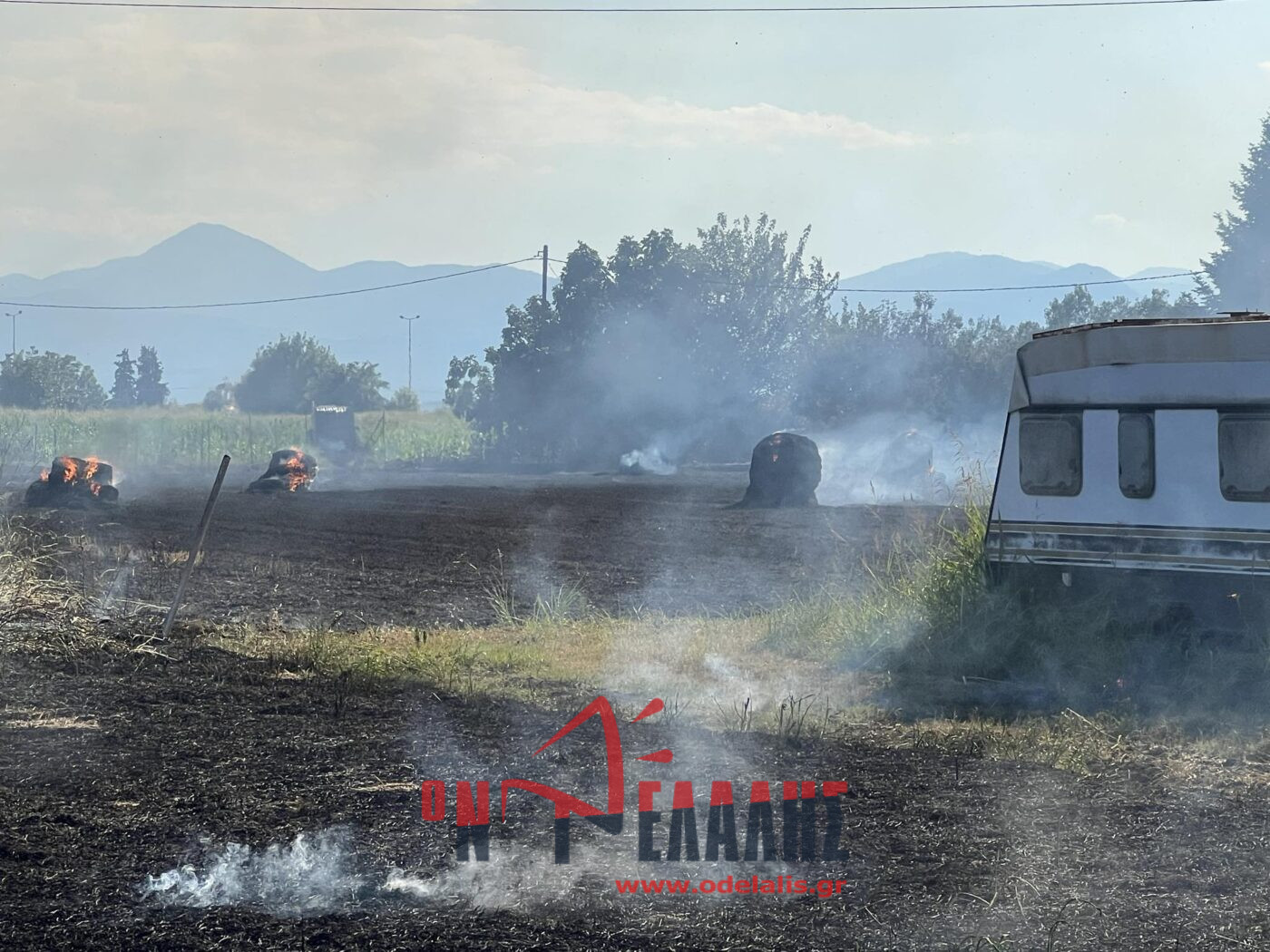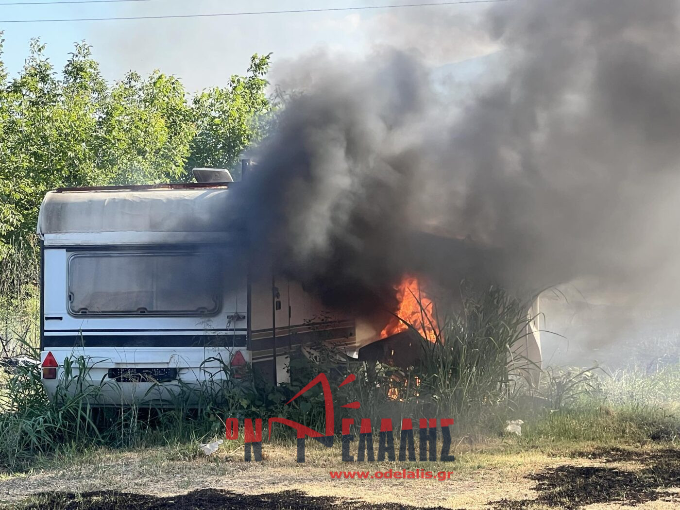 Στις φλόγες τυλίχθηκε ένα τροχόσπιτο που βρίσκεται μέσα σε χωράφι. Από τη φωτιά κινδυνεύει και σπίτι.