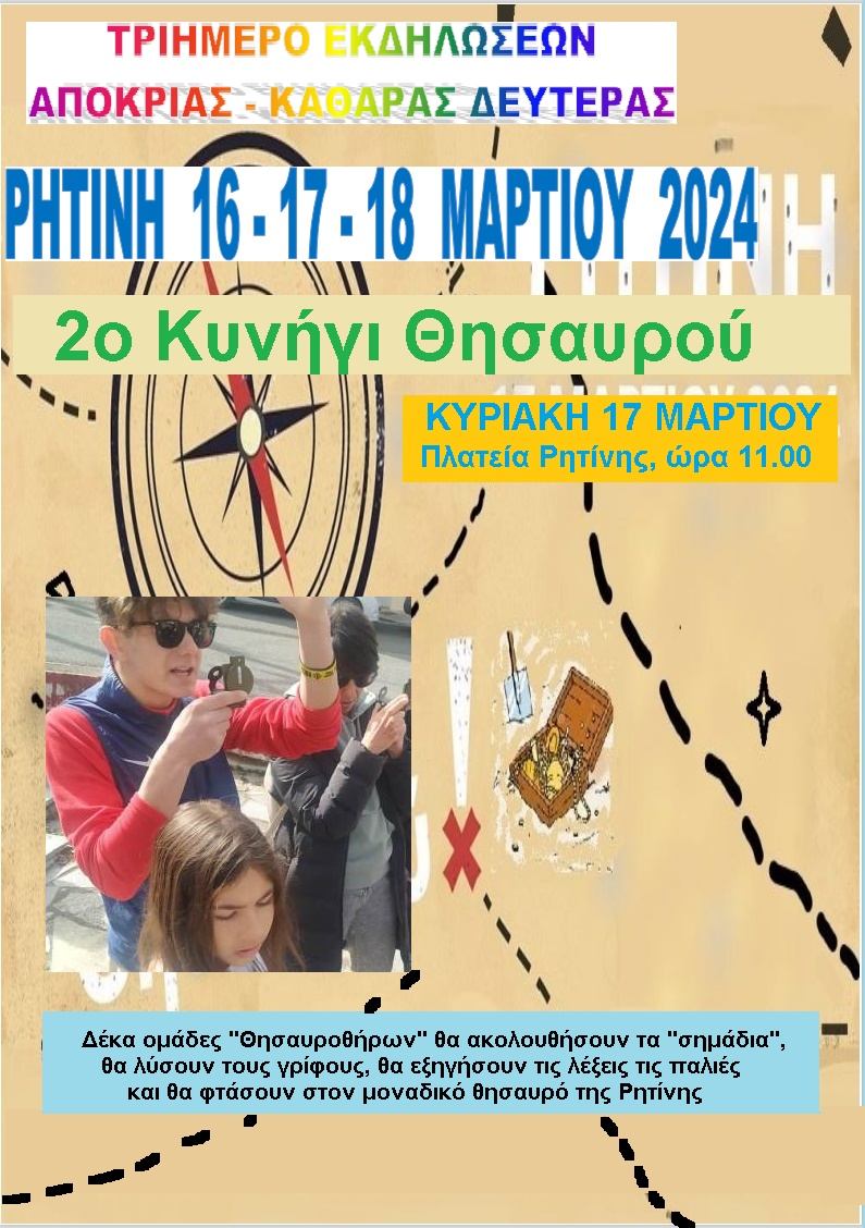 Την Κυριακή 17 Μαρτίου, στις 11.00 το πρωί ξεκινά το 2ο «Κυνήγι Θησαυρού» το οποίο μεγάλωσε σε συμμετοχές μετά την μεγάλη επιτυχία που είχε η πρώτη προσπάθεια πέρυσι.   Είναι ένα παιχνίδι για μικρούς και μεγάλους που η διαδρομή της ανακάλυψης του θησαυρού, συνδέεται με τοπικές ιστορίες, τοποθεσίες, το τοπικό γλωσσικό ιδίωμα.