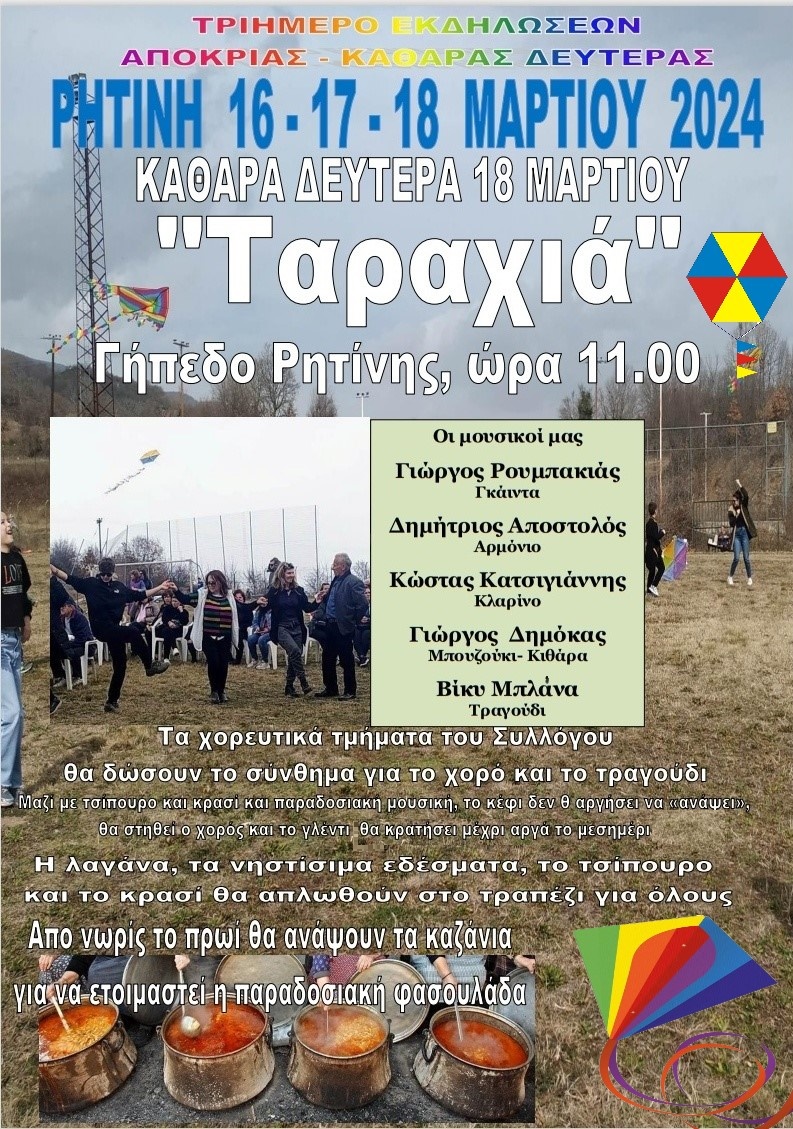 Ο Χιονοδρομικός Αθλητικός Ορειβατικός Σύλλογος σε συνεργασία με το Τοπικό Συμβούλιο Ρητίνης και τους συλλογικούς φορείς του χωριού ξεκινούν την διοργάνωση των σταθερών ετήσιων εκδηλώσεων του χωριού με το τριήμερο του τελευταίου Σαββατοκύριακου της Αποκριάς και της Καθαράς Δευτέρας (16-17 και 18 Μαρτίου 2024).